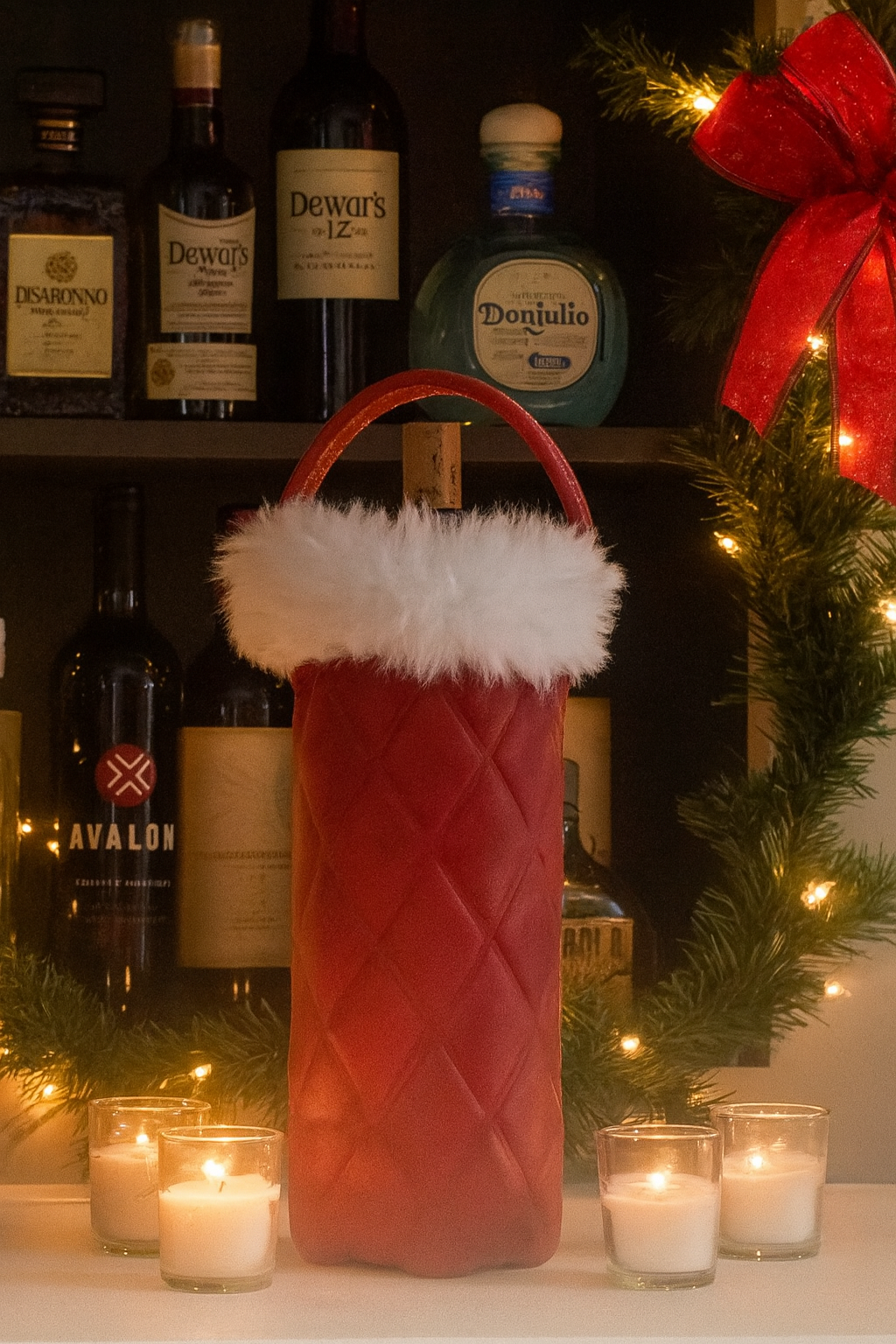 …DAZZLE THIS HOLIDAY SEASON…. with a custom made GENUINE RED LEATHER Wine Tote. A UNIQUE EMBOSSED DIAMOND PATTERN AND THE AUTHENTIC WHITE HAIR ON HIDE CUFF OR WHITE SYNTHETIC FUR CUFF; tops it off just perfect, so you and your gift of wine will arrive in style.