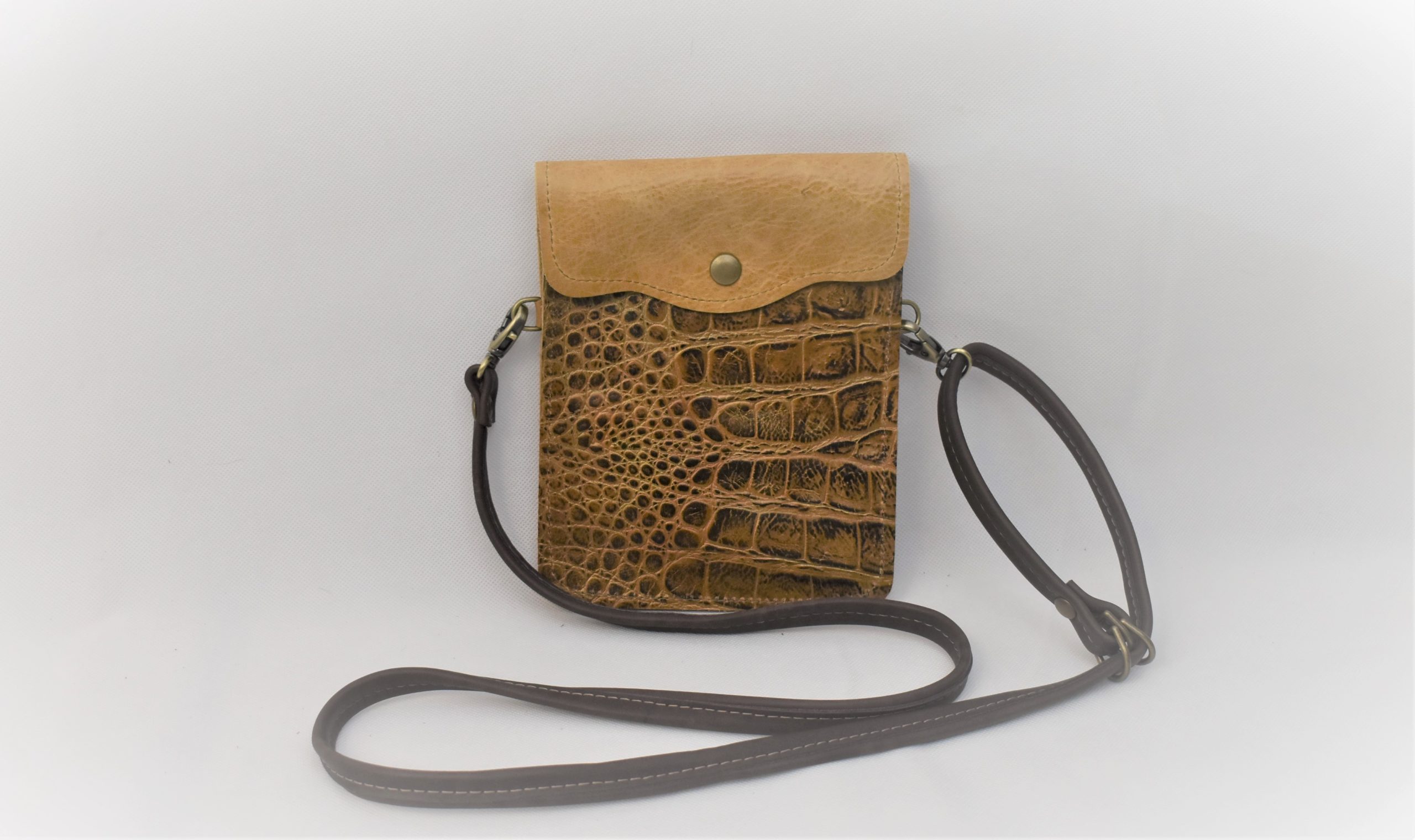 Top Grain Cowhide Leather, Three interior compartments- 2 for phone, keys, lipstick, etc- 1 sewn to accommodate ID & Credit Cards, The strap is crossbody, adjustable and removable. We have 2 sizes available for large and smaller phones.