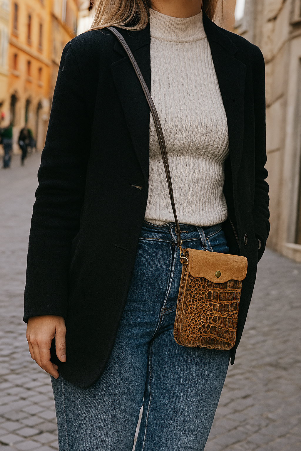 Three Interior Compartments: Two cell phone sized compartments, and horizontal space for 6 credit cards comfortably, also space for keys, lipsticks and other minimalist’s essentials.