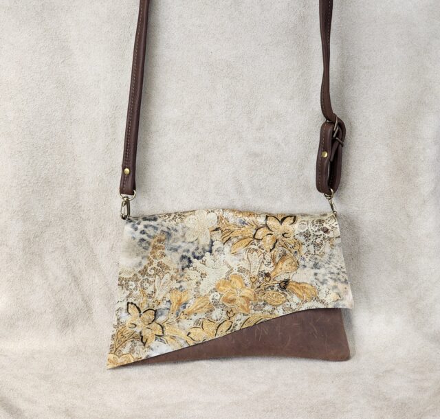 Top Grain Cowhide Body and Trim, Serigraph Leather Accent Flap, Antique Brass Metal Removable Chain, Ultra Suede Lining with Antique Brass Magnetic Snap Closure, Measures, 12 1/2″ W x 8″ H