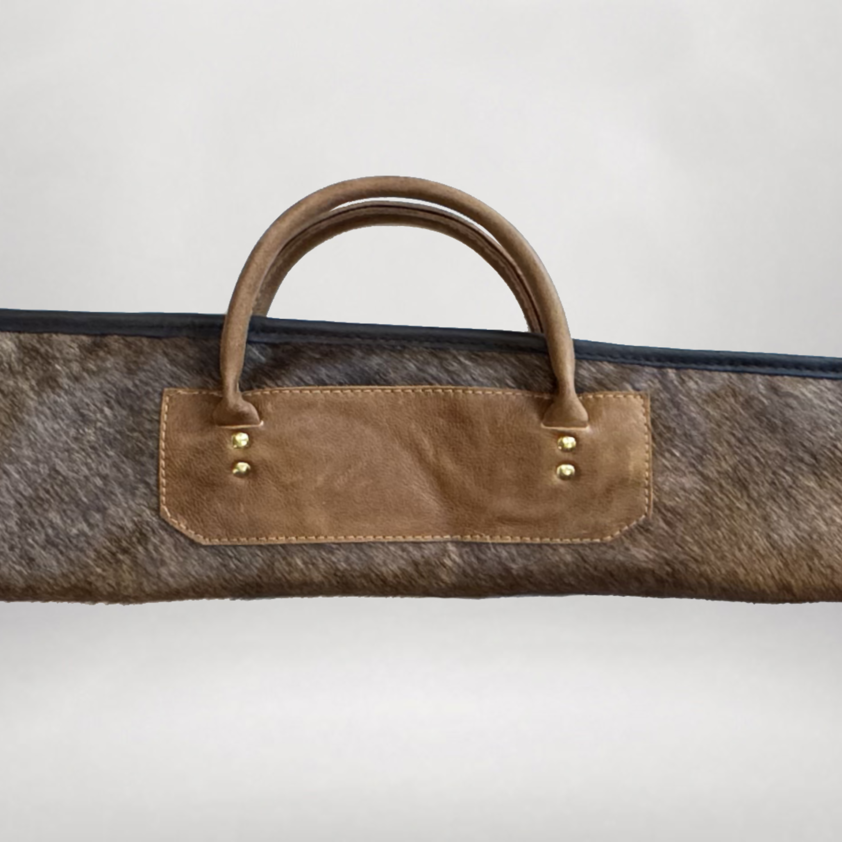 Handcrafted hair on hide leather gun slip featuring Sherpa lining, solid brass hardware, and traditional hand-stitched construction. Handmade in the USA.