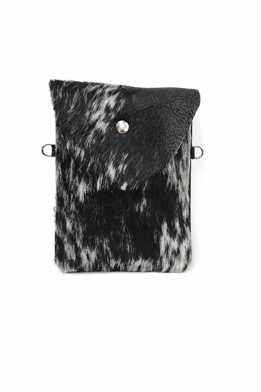 This striking style features a genuine black hair-on-hide leather front and back with a natural-edged leather flap. Natural variations in the hide ensure that no two purses are ever exactly alike.