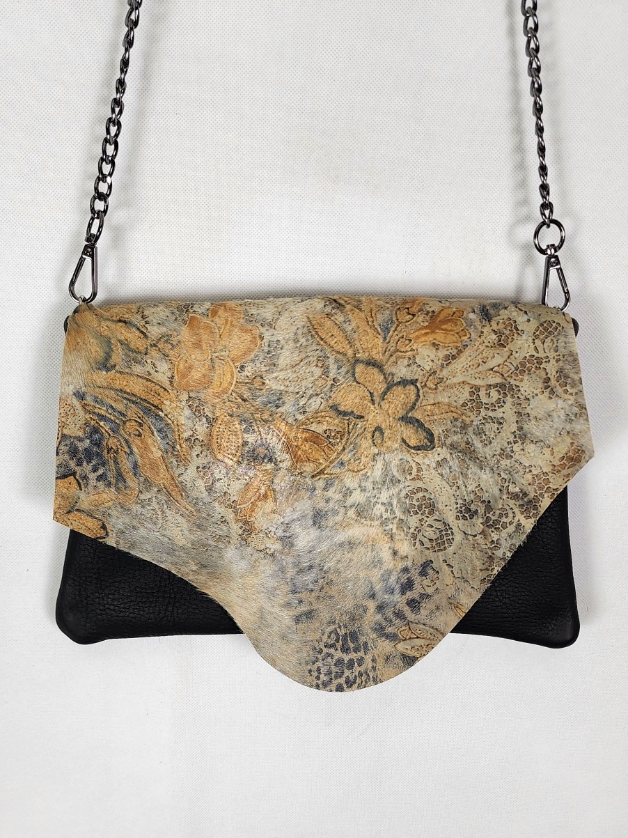 Top Grain Cowhide Leather Body and Trim, Serigraph Leather Accent Flap, Ultra Suede Lined Interior with Antique Brass Magnetic Snap Closure, 48″ Antique Brass Metal Detachable Chain. Measures: 12 1/2″ W x 8″ H.